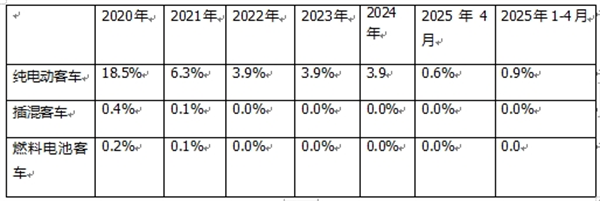 ---燃料电池客车动力电池装机量占据新能源汽车大盘的比例很少,从2020年的0.2%占比下降到2021年的0.1%占比,然后从2022年到2025年前4月占比均为零。