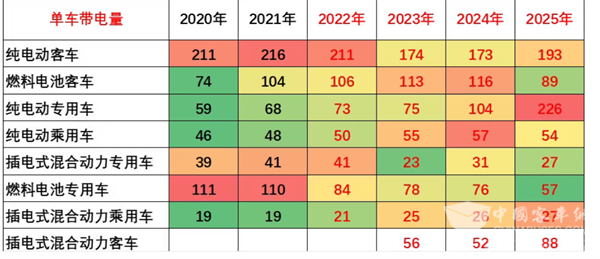 六、各类技术路线新能源客车单车平均带电量简析