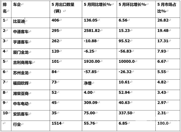 5月新能源客车出口:销1514辆同环比“双增” 比亚迪\中通\宇通居前三