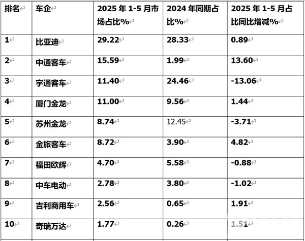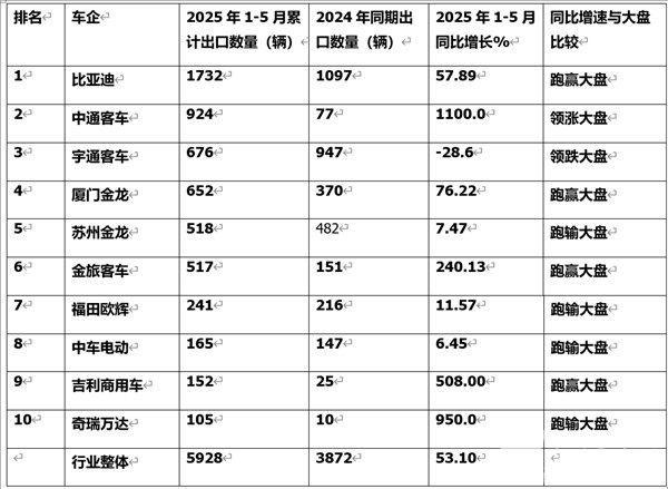 上表显示,在2025年5月我国新能源客车出口前10企业销量、同比及市场占比中: