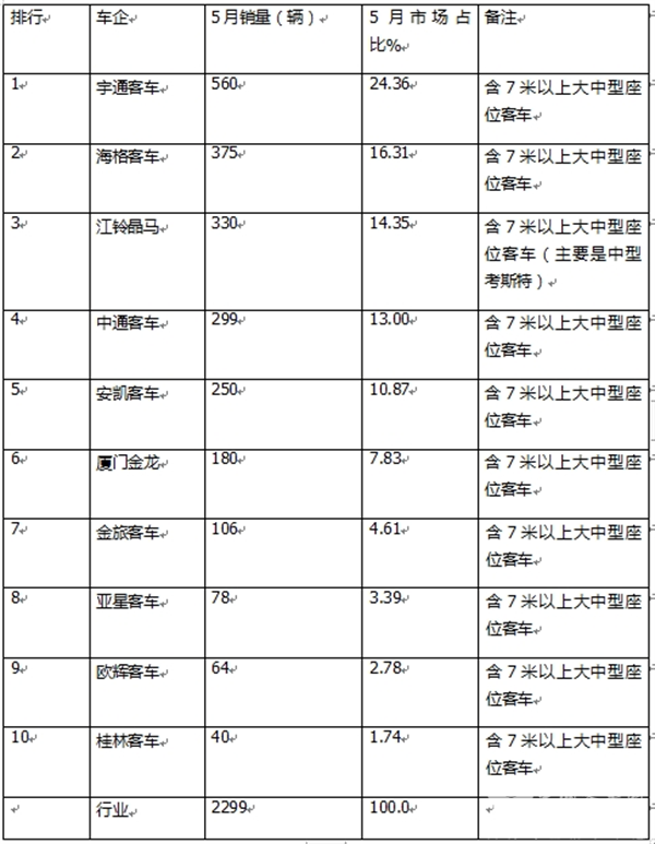 一、5月大中型座位客车排行:宇通夺冠,海格\晶马分列二三