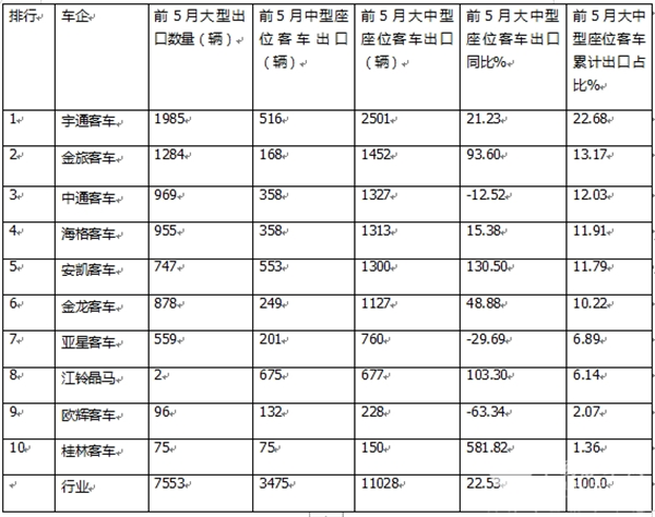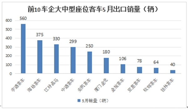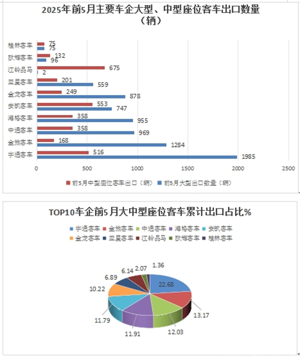2025年5月大中型座位客车及公交客车出口排行出炉