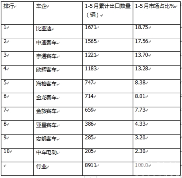 四、前5月公交客车出口:比亚迪强势领跑;中通\宇通分列二三