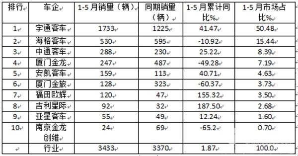 5月新能源座位客车:同环比“双降”再遇冷;宇通霸榜,海格\吉利分列二三