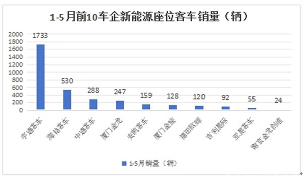 上图表显示,在2025年前5月大中型新能源座位客车前10车企累计销量中: