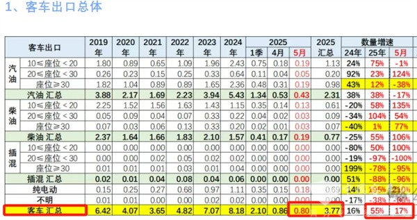 根据中国汽车流通协会提供的海关数据,2025年5月我国客车出口0.8万辆,同比增长17%;2025年1-5月我国客车累计出口3.77万辆,累计同比增长55%(见截图1)。