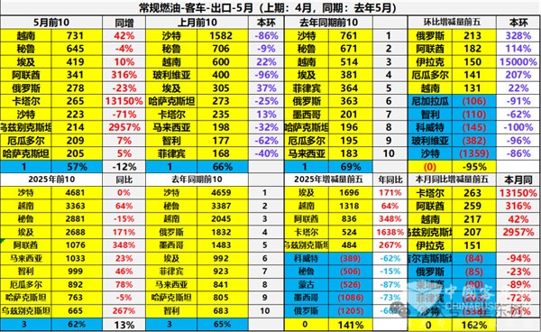 上表显示,2025年5月我国客车出口到TOP10国家中,出口数量同比及市场占比:
