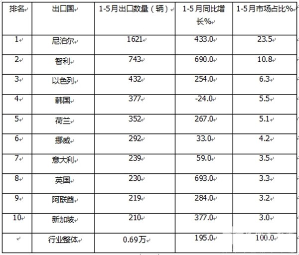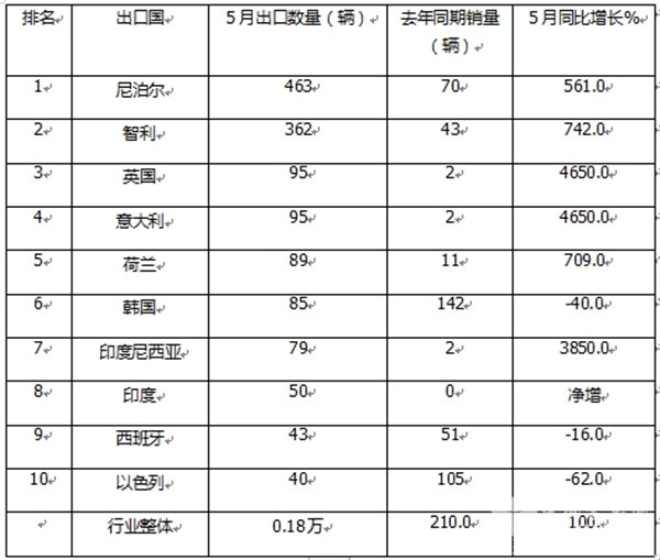 四、5月纯电动客车出口国:尼泊尔、智利、英国居前三;前10同比7增3降