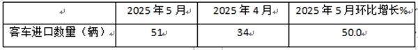 表1,根据中国汽车流通协会提供的海关数据,2025年5月我国客车进口数量环比增长50%: