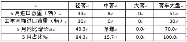 注:由于中国汽车流通协会提供的客车进口数据中,未将各类客车进口国家详细列出,故无法判断今年5月各类客车到底是从哪些国家进口的。