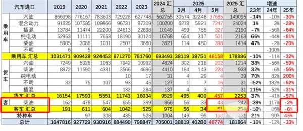 表6,根据中国汽车流通协会数据(截图2),2025年5月各类动力的客车进口数量及占比: