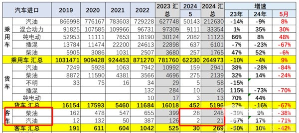截图4,2024年5月及1-5月各种动力客车进口数量(数据来源:中国汽车流通协会)
