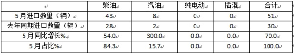 ---柴油类客车进口51辆,同比增长54%;市场占比84.3%,占绝对的主体部分,跑输客车进口大盘;据分析主要还是柴油类客车动力比较强劲,加之比汽油更经济。