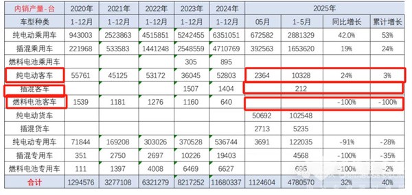 截图3,2025年5月及前5月各技术路线新能源客车装机量及同比(数据来源:中国汽车流通协会)