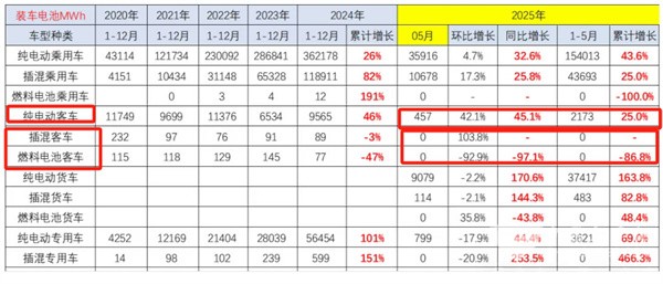 值得关注的是, 2025年5月我国新能源客车动力电池装机量大约为457MWh(将截图3中2025年5月份的纯电动客车装车量457MWh+2025年5月的插电式混动客车装车量0MWh+2025年5月的燃料电池客车的装车量0MWh) ,同比(2024年5月新能源客车装车量为315MWh)增长45.1%;2025年前5月新能源动力电池累计装机量大约为2173MWh,同比增长25%。