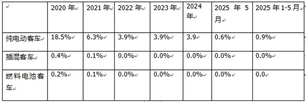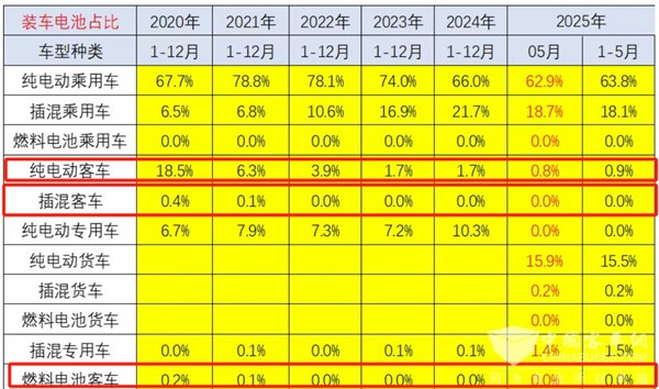 ---燃料电池客车动力电池装机量占据新能源汽车大盘的比例很少,从2020年的0.2%占比下降到2021年的0.1%占比,然后从2022年到2025年前5月占比均为零。