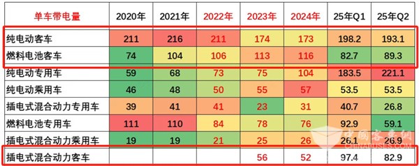 ---2025年前5月插混客车单车平均带电量为90.15KWh(将2025年一季度和二季度的(97.4+82.9)/2=90.15KWh,,处于近年最高,说明插混客车带电量越来越大,一方面也反映了插混客车车型越来越大(实际上是大型插混客车占比越来越高)。