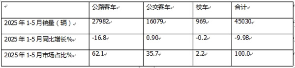 上表可见,在2025年1-5月5米以上公路、公交、校车三大细分市场中: