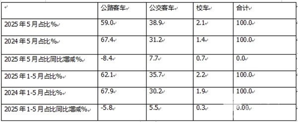 上表可见,在2025年5月5米以上公路、公交、校车三大细分市场中: