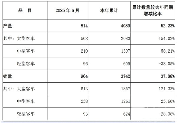 近日,中通客车发布了2025年6月份及上半年产销数据快报。