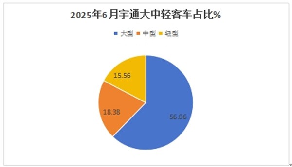 大中型客车依然是绝对主体。今年6月份,宇通大型客车销量占比为56.06%,超半壁江山;中型客车销量占比为28.38%,居第二;轻型客车销量占比为15.56%,居第三;可见宇通客车大中型客车累计占比超8成(84.44%),依然是宇通客车市场的绝对主体部分。