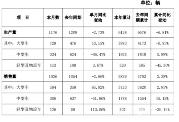 1、6月:销售4283辆降9.83%;中型同比唯一增长
