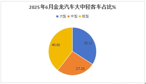 ---从产品销售结构来看,2025年6月份,金龙汽车轻型客车销量最多(占比40.65%)领跑,成为2025年6月金龙汽车市场的主体部分;大型客车销量占比35.12%居第二,中型客车占比27.23%,居最小;