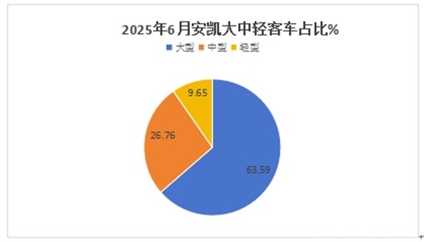 ---从产品销售结构来看,2025年6月份,安凯大型客车销量最多(占比63.59%),成为2025年6月安凯客车市场的绝对主体部分;中型客车销量占比26.76%居第二;轻型客车占比9.65%,居最少;