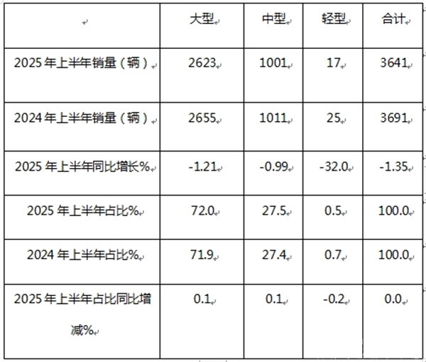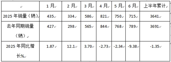 根据终端上牌数据,2025年6月大中型国六燃气类客车(含6米及以上,下同)销售715辆,同比(2024年6月燃气客车销售789辆)下降9.38%;2025年上半年累计销售燃气客车3641辆,比去年同期累计销售的3691辆下降1.35%;可见,无论是今年6月还是上半年,国内 燃气类客车同比均下降,且降幅均在个位数以内。