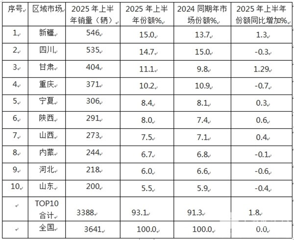 根据终端上牌信息显示,2025年上半年国六天然气客车全国区域销量流向不均衡,主要销往新疆、四川、甘肃、重庆、宁夏、陕西等气源比较丰富、且加气站网点比较密的区域。