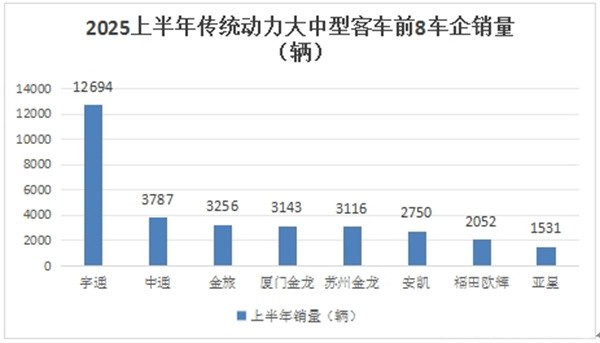 根据中国客车统计信息网数据,2025年上半年大中型传统动力客车TOP8累计销量排行(只统计累计销量在1500辆以上车企):