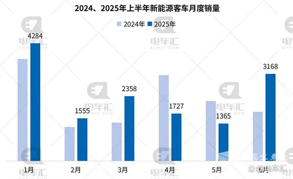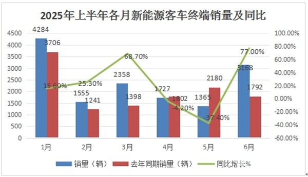 根据终端上牌数据,2025年上半年各月新能源客车销量及同比: