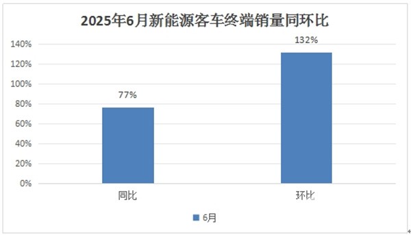 根据终端上牌数据,2025年6月新能源客车销售3168辆,环比大涨132%,同比大涨77%。