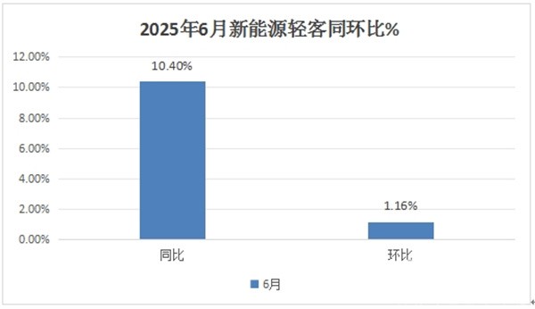 根据终端上牌数据,2025年6月我国新能源轻客实销24340辆(含4.5米—7米车型,以4.5米—6米封闭厢式的轻客物流车型为主体,下同),同比增长10.4%,环比增长1.16%,可见今年6月新能源轻客呈现同环比“双增”,表现较好。
