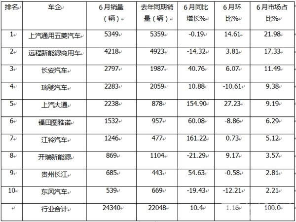 二、6月:五菱领跑;远程\长安分列二三;前10同比6增4降、环比6增4降;江铃\大通分别领涨同环比