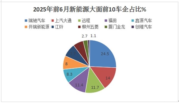 上两图可见,在2025年上半年新能源轻客大面市场中,瑞驰\大通\远程居前三,特别是重庆瑞驰汽车累销12998辆,是唯一销量超10000辆的车企,市场占比近四分之一(24.5%),可谓一家独大。