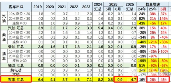 根据中国汽车流通协会提供的海关数据,2025年6月我国客车出口0.9万辆,同比增长45%;2025年1-6月我国客车累计出口4.7万辆,累计同比增长26%(见截图1)。