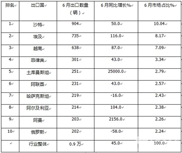 上表显示,2025年6月我国客车出口到TOP10国家中,出口数量同比及市场占比: