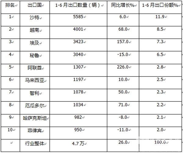 三、前6月燃油类客车出口国:沙特\越南\埃及居前三;前10国同比7增3降,阿联酋领涨