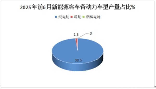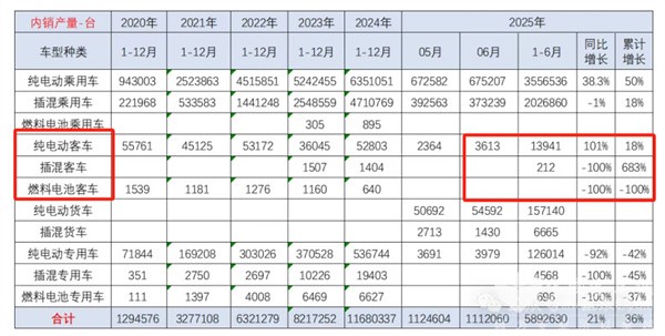 根据中国汽车流通协会数据(见截图1),2025年6月我国新能源客车产量为3613辆(纯电动客车3613辆+插电式混动客车0辆+0辆燃料电池客车,不含新能源物流客车,下同),同比增长101%;2025年前6月新能源客车累计产量为14513辆(含纯电动客车13941辆+插混客车212辆+0辆燃料电池客车),累计同比(去年同期新能源客车累计产量为11841辆)增长22.57%。