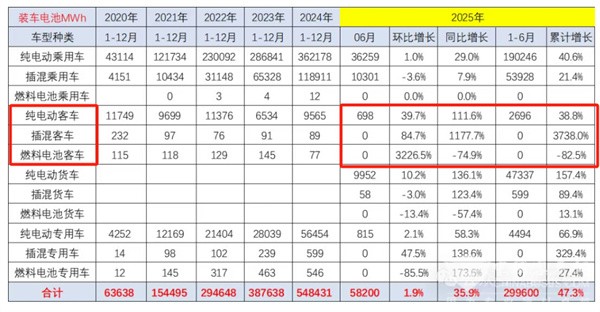 值得关注的是, 2025年6月我国新能源客车动力电池装机量为698MWh(将截图3中2025年6月份的纯电动客车装车量689MWh+2025年6月的插电式混动客车装车量0MWh+2025年6月的燃料电池客车的装车量0MWh) ,同比(2024年6月新能源客车装车量为325MWh)增长112%;2025年前6月新能源动力电池累计装机量大约为2996MWh,同比增长39%。