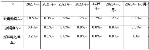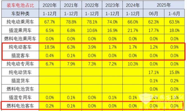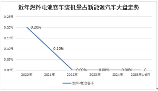 ---燃料电池客车动力电池装机量占据新能源汽车大盘的比例很少,从2020年的0.2%占比下降到2021年的0.1%占比,然后从2022年到2025年前6月占比均为零。