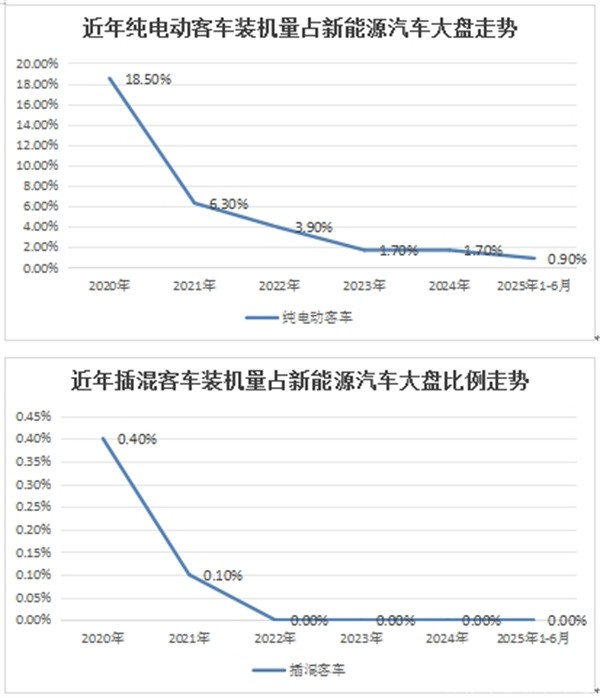 ---插电式混合动力客车动力电池装机量占据新能源汽车大盘的比例很少,从2020年的0.4%占比下降到2021年的0.1%占比,然后从2022年到2025年前6月占比均为零。