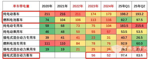 截图4,2025年前6月及近6年各类新能源客车单车平均带电量比较(数据来源:中国汽车流通协会提供)