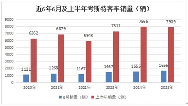 根据终端上牌数据,2025年6月考斯特客车销售1656辆,同比增6.5%,环比增长18.4%,呈现同环比“双增”,说明2025年6月考斯特客车市场表现良好。