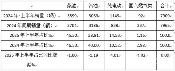 表3,根据终端上牌数据统计,按动力种类划分,2025年上半年考斯特客车销量结构: