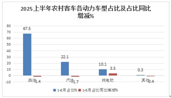 终端上牌数据显示,在2025年上半年,农村客运市场中销量占比最大的是柴油动力车型,其次为汽油。柴油占比近7成,但同比有减少趋势,纯电动占比最小,但占比同比提升幅度最大。