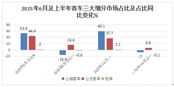 2025年6月及1-6月5米以上客车三大细分市场占比呈现以下特点: