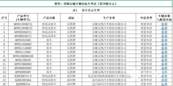 上图可见,在交通部第78批上榜的达标的道路运输客车车型公告中: