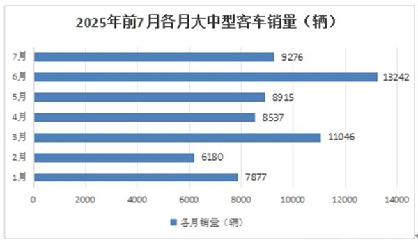 根据中国客车统计信息网数据,2025年1-7月各月我国大中型客车销量统计: